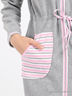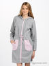 Теплый и невероятно нежный, приятный на ощупь халат серого цвета с полосатыми розовыми вставками. Капюшон с хлопковой подкладкой. Застегивается на молнию. Длинные рукава. Талия подчеркнута кулиской. два накладных кармана. На спине вышивка.