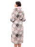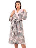 Халат с длинными рукавами и накладными карманами. Воротник - капюшон с контрастной отделкой из однотонного флиса . Завязывается на пояс. Длина ниже колена.