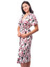 Халат женский на запах из набивного вискозного трикотажного полотна. Завязывается на пояс. Срез горловины и запаха обработаны планкой. Рукав цельнокроеный короткий. Силуэт прямой. Длина до колена.