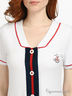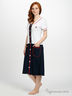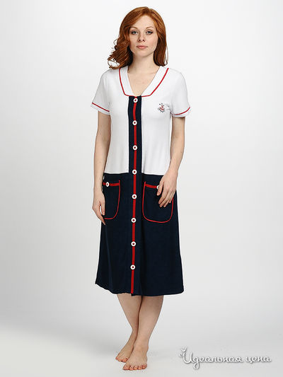 Халат на пуговицах, отрезной по линии бёдер. Накладные карманы, застёгивающиеся на пуговицы. По планке застёжки и на карманах проложена тесьма контрастного цвета. На груди вышивка шёлковой нитью.