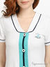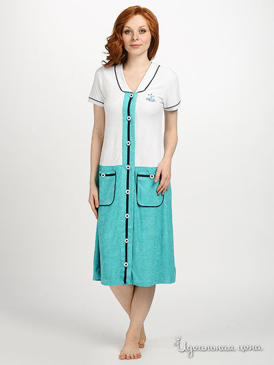 Халат на пуговицах, отрезной по линии бёдер. Накладные карманы, застёгивающиеся на пуговицы. По планке застёжки и на карманах проложена тесьма контрастного цвета. На груди вышивка шёлковой нитью.