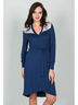 Роскошный халат из вискозы в спокойном тёмно-синем оттенке, вдохновляет своей глубиной. Дизайн изделия "на запах", для вашего комфортна внутри продуманы завязки. Оригинальность дизайну придают вставки из белого гипюра и удлиненная спинка изделия.