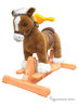 Красивая музыкальная качалка в виде грациозной лошадки с ручками и платформой для ножек имеет инновационную шарнирную основу. Подходит детишкам от 1-ого до 3-х лет. Работает от батареек. Миленькая коричневая лошадка с белой гривой, хвостиком и носиком сделана из мягкого нежного плюша. Её добрые глазки выглядят очень реалистично. Маленький пони стоит на специальной пластиковой устойчивой подставке. Малыш располагается верхом на удобном седле и держится за большие пластмассовые ручки, расположенные позади головы, поставив ножки на платформу. Современная подшипниковая система позволяет раскачиваться на пони вперёд-назад и вверх-вниз. На жёлтой панели с ручками находятся разноцветные кнопочки, при нажатии которых раздаются различные звуки – лошадиное ржание, стук копыт и приятные мелодии. Это сопровождается миганием ярких огоньков.
