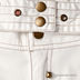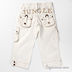 Модель прямого кроя застегивается на кнопку и молнию. Сзади на поясе пришита петля для ремня. К боковым швам пришит декоративный пояс, застегивающийся на кнопки. Манжеты брюк на кнопках. Два кармана спереди, два кармана сзади, два кармана на брючинах. Задние карманы и карманы на брючинах застегиваются на кнопки. Множественные декоративные металлические элементы.