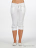 Легкие брюки-капри. Три кармана спереди, два накладных кармана с клапанами сзади. Есть шлевки для ремня. Застежка на молнию и две пуговицы. Пояс и манжеты посажены на трикотажную резинку. В поясе также расположена кулиска с продетым в нее шнурком, позволяющим регулировать ширину изделия. Анатомический крой колен.