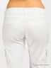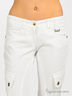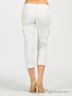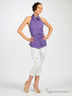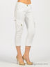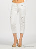 Женские капри из мягкого денима. Отрезной пояс, шлевки для ремня. Застегиваются на молнию и пуговицу. Два втачных кармана спереди, два накладных с клапанами сбоку, имитация прорезных сзади.