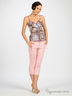 Зауженные к низу джинсовые капри. Отрезной пояс, есть шлевки для ремня. Застегиваются на молнию и пуговицу. Спереди два прорезных кармана на молнии. Сзади треугольная кокетка.