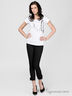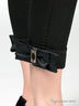 Посадка брюк по фигуре. Пояс застегивается на пуговицу и молнию, дополнен шлевками для ремня. Имитация карманов спереди, два накладных кармана сзади. Низ брюк дополнен манжетами. По внутренней стороне брючин застежки-молнии. На манжетах декоративные бантики, пришитые к изделию.