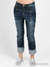 Оригинальные капри зауженного кроя из плотного денима. Отрезной пояс со шлевками для ремня. Застежка на молнию и пуговицу. Прямоугольная кокетка. 5 карманов. Брючины с отворотами.
