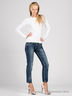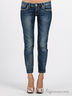 Джинсовые зауженные капри, комфортная и женственная модель. Отрезной пояс, есть шлевки для ремня. Семь карманов. Застегиваются на молнию и пуговицу. Декорированы контрастной прострочкой и эффектом потертости.
