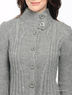 Детали: застежка на пуговицы, воротник-стойка, длинный прямой рукав и низ изделия на резинке в рубчик, полочка и спинка декорированы вязкой "коса"
