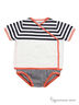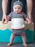 Очаровательный комплект в морском стиле из 100% хлопковой пряжи , состоящий из кардигана и трусиков. Кардиган с короткими рукавами с V-образным вырезом горловины, застежка на кнопки. Трусики на эластичной резинке и оранжевой окантовкой по бокам. Прекрасный вариант для повседневной носки.