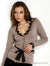 Детали: застежка на пуговицы, длинный прямой рукав и полочка декорированы кружевом, в шлевки продет атласный пояс