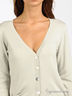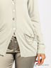 Легкий трикотажный кардиган прилегающего силуэта. Длинный прямой рукав с манжетой. Глубокий вырез горловины. На полочке застежка на перламутровые пуговицы. Спереди накладные карманы, декорированные цепочкой.