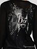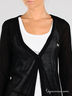 Тонкий кардиган из полупрозрачного трикотажа. Длинный рукав. Глубокий вырез. Застежка - пуговица. На полочке пришита металлическая подвеска, инкрустированная стразами, выполнена в виде логотипа бренда. Спинка расшита пайетками и декорирована стразами..