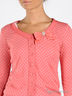 Тонкий трикотажный кардиган в мелкий горошек. Округлый вырез горловины. Планка-застежка с пуговицами, обтянутыми шелковой тканью в тон. Длинный рукав. Манжеты и низ изделия выполнены в виде трикотажной резинки. В дополнение к изделию идет шелковый бантик - брошка, вручную расшитая бисером и стразами.