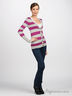 Мягкий трикотажный кардиган мелкой вязки прямого кроя. Застегивается на пуговицы. V-образный вырез горловины дополнен трикотажной резинкой в рубчик. Длинный прямой рукав и низ изделия дополнены трикотажной резинкой в рубчик. Два накладных кармана. Кардиган декорирован двухцветными полосами.