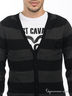 Стильный кардиган с V-образным вырезом горловины и застежкой на пуговицы. Низ изделия и манжеты рукавов оформлены в рубчик. На полочке нашивка и металлическая вставка.