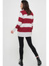 Особенности: Вязаный кардиган в широкие контрастные полоски прямого силуэта выполнен из полушерстяной пряжи. Кардиган с шалевым воротником и защипом на спинке.