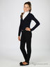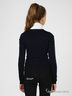 Классический кардиган темно-синего цвета. V-образный вырез. Застегивается на пуговицы. Манжеты и низ изделия посажены на трикотажную резинку.