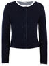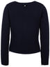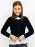 Являясь важным атрибутом школьной формы, синий вязаный кардиган создает тепло и комфорт. Технология вязания двулицевой гладью образует оригинальный цветовой контраст между лицом и изнанкой изделия, а также делает кардиган очень мягким и приятным на ощупь. Несмотря на темные матовые стразы в оформлении передней части изделия, суппатную застежку с внутренней планкой из репсовой тесьмы и небольшой брендированный навесной декор на спинке модели, кардиган выглядит строго и лаконично. Он может стать достойной альтернативой пиджаку, разнообразив повседневный образ ученицы.
