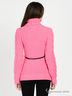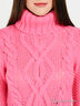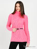 Яркая туника из эластичного трикотажа крупной вязки. Воротник-гольф. Длинные прямые рукава с манжетами. По центру полочки проходит рисунок из переплетающихся полос. Две шлевки для ремня. Изделие дополнено тонким кожаным ремешком с бантиком.