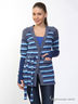 Кардиган с актуальным рисунком в полоску застежкой на пуговицы. Модель дополнена поясом такой же расцветки.
