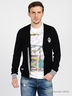Стильный кардиган из эластичного трикотажа средней плотности. V-образный вырез горловины, застежка ан пуговицы, длинный рукав и низ изделия на манжете, два кармана. Декорирован вставками с рисунком - полоска и вышивкой на полочке.
