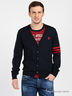 Отличный джемпер с эффектом двойки, имитирующим кардиган с футболкой. Выполнен из эластичного трикотажа средней плотности и тонкой трикотажной ткани в полоску. Длинный рукав и низ изделия на манжете из рибаны, застежка на пуговицы, округлый вырез горловины, два кармана. Декорирован принтами. Стильная модель из качественных материалов.