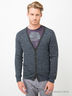 Кардиган тонкой вязки с меланжевым эффектом. Модель выполнена из высококачественной пряжи с добавлением шерсти альпаки, льна и хлопка. Глубокий V-образный вырез, застежка на пуговицы оформлены контрастной планкой. Низ кардигана и низ рукава в рубчик.
