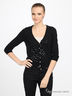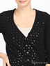 Классический вязаный кардиган прямого кроя. Застегивается на пуговицы. Округлый вырез горловины. Длинный прямой рукав. Кардиган декорирован бусинами и пайетками.