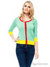 Оригинальный и стильный кардиган на пуговицах с округлым вырезом горловины. Рукав 3/4. Низ изделия, рукава и ворот окантованы в «рубчик» Кофта украшена контрастной отделкой. Теплый и практичный вариант для создания женственного образа.