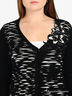 Нарядный кардиган из тонкого джерси приталенного силуэта. Застежка на пуговицы, длинный прямой рукав. Полочка активно дополнена множеством декоративных элементов. Отлично сочетается с классическими брюками и с прямой юбкой.