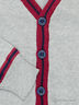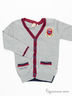 Практичный кардиган для гардероба Вашего ребенка. Модель с V-образным вырезом горловины и длинными рукавами. Центральная застежка на пуговицы. Оформлена обманными карманами и контрастным принтом.