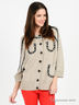 Оригинальный шерстяной кардиган с укороченным рукавом и округлым вырезом горловины застегивается на пуговицы. Три накладных кармана. Изделие украшено пришитыми элементами. Необычный вариант на каждый день.