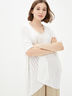Вязаный кардиган выполнен из хлопчатобумажной пряжи. Изделие имеет структурный рисунок. Удлиненная спинка. Короткие рукава, широкие к низу. Изделие без застежки.