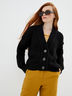 Кофта средней длины на пуговицах. Изделие выполнено крупной вязкой из теплой и мягкой пряжи. Крой свободный. V-образный вырез горловины. Спущенные плечи. Длинные рукава. Манжеты вывязаны резинкой.