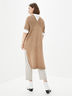 Вязаный кардиган выполнен из хлопчатобумажной пряжи. Изделие имеет структурный рисунок. Удлиненная спинка. Короткие рукава, широкие к низу. Изделие без застежки.
