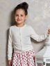 Кардиган для девочки умеренного объема. Передняя часть полностью расшита жемчужными полусферами. Застежка вдоль планки на жемчужные пуговицы.