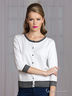 Кардиган с рукавами 3/4 и округлым вырезом горловины. Модель облегающего фигуру кроя дополнена спереди застежкой на пуговицы. Отличный вариант на каждый день.