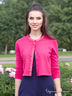 Кардиган с рукавами 3/4 и округлым вырезом горловины. Модель облегающего фигуру кроя дополнена спереди застежкой на пуговицы. Изделие дополнено декоративными камнями.
