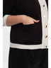 выполнен в технике «ручного вязания» из натуральных нитей с содержанием шерсти. Круглый вырез, низ втачных рукавов и низ изделия обработаны бейкой платочной вязки. По планке переда — застежка на пуговицы. По переду изделия вывязаны накладные карманы.