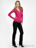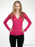 Приталенная модель застегивается на пуговицы на полочке по всей длине изделия. V-образный вырез.
