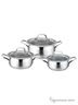 6пр.: 1,7л(16см), 2,4л(18см), 3,3л(20см), крышки стекл., ручки из нержав. стали, капсулир. дно, стенки 0,7мм, поверхность матов. с зерк. полосой. Состав: нержав. сталь.