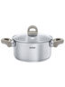 Кастрюля 20 см со стеклянной крышкой. Материал: высококачественная нержавеющая сталь 18/10. Жаропрочные металлические ручки с пластиковыми держателями. Вместимость: 2,8 л. Высота: 9,5 см. Крышка с отверстием для отвода пара из термостойкового закаленного стекла. Матовая поверхность снаружи и блестящая глянцевая поверхность внутри, измерительная шкала для определения литража. Прочное трехслойное капсульное дно. Подходит для всех типов плит. Можно мыть в посудомоечной машине.