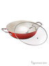 Казан со стеклянной крышкой имеет черное эмалевое покрытие, эмалевое внешнее покрытие, индукционное дно, металлические клепанные ручки. Размер: 28x9,4 cм; 4 л, чугун.
