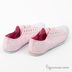 Розовые кеды с заостренным мысом без шнурков. К язычку пришиты резинки, другим краем они крепятся под стелькой. Декоративные аппликации.