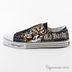 Стильные кеды Ed Hardy выполнены из текстиля цвета хаки, украшенного затейливым брутальным принтом. Резиновый мыс подчеркивает классический силуэт модели. Шестипазовая шнуровка носит декоративный характер, так как язычок пришит к основанию, и шнурки отсутствуют.
