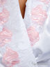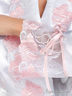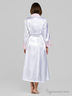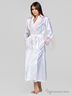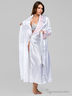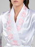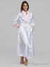 Изящный длинный халат с запахом. Внешний пояс состоит из двух полосок ткани, пришитых к боковым швам и продетых в декоративные шлевки. Есть дополнительные внутренние завязки. Воротник и широкие манжеты рукавов декорированы тонкой сеточкой с шитьем атласными нитями розового цвета. В боковых швах прорезные карманы.