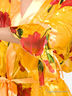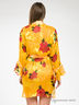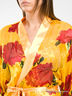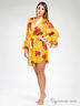 Яркий и притягательный халатик выполнен из тонкого матового и более плотного блестящего натурального шелка. Модель с запахом, без карманов и внутренних завязок. Внешний съемный пояс продет в шлевки. Рукава с воланообразными манжетами декорированы шелковой тесьмой с завязками.